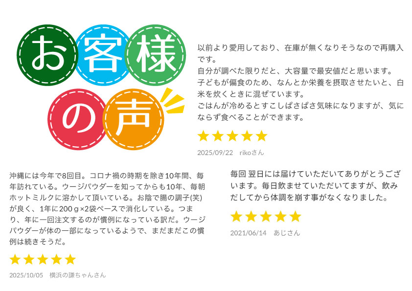 製品粒度の調整が可能なため、製菓・パン・麺類・加工肉類・乳製品への使用をはじめペットフード・科商品などへの応用も提案しています。(ウージパウダーはアレルギー食品25項目に含まれていません。)